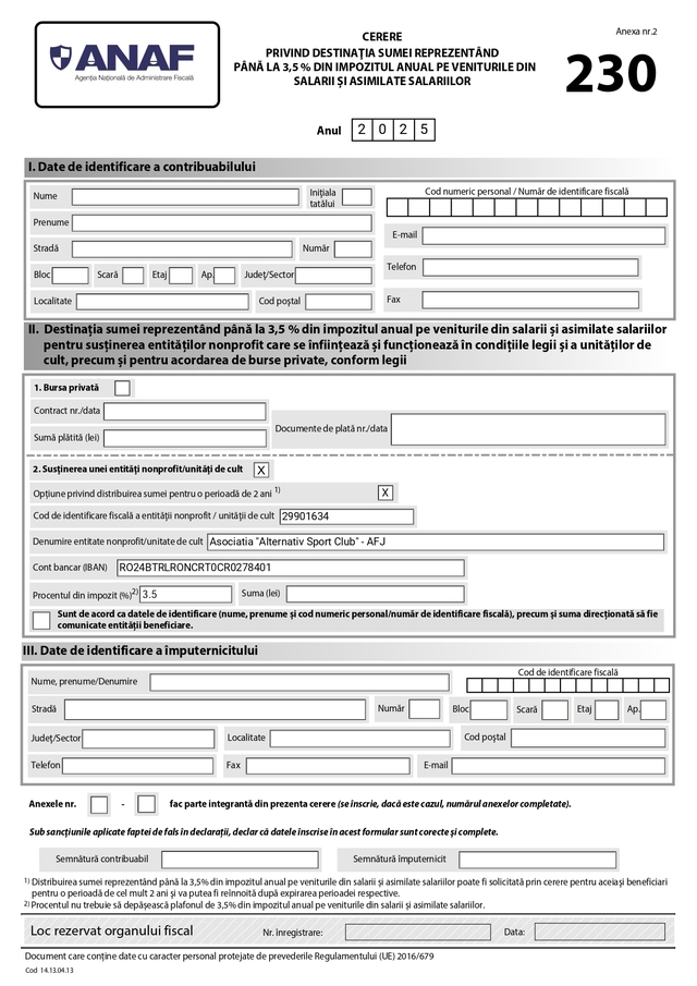 Puteți genera fișierul online de aici formular230.ro/asociatia-alternativ-sport-club-afj și apoi să-l trimiteți prin e‑mail la adresa de mai jos.